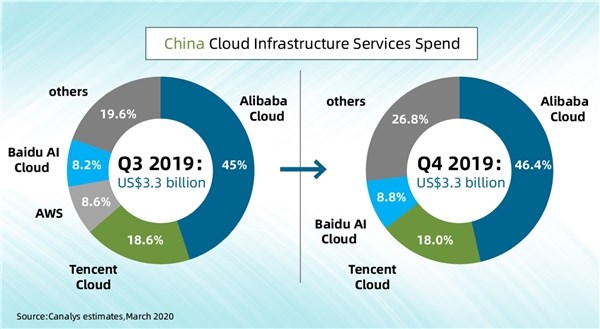 數(shù)據(jù)顯示,在2019年第三季度,阿里云排名第一,份額為45%;騰訊云份額18.6%、AWS份額8.6%、百度智能云份額8.2%。到2019年第四季度,阿里云份額擴(kuò)大至46.4%,騰訊云18%、百度智能云8.8%。